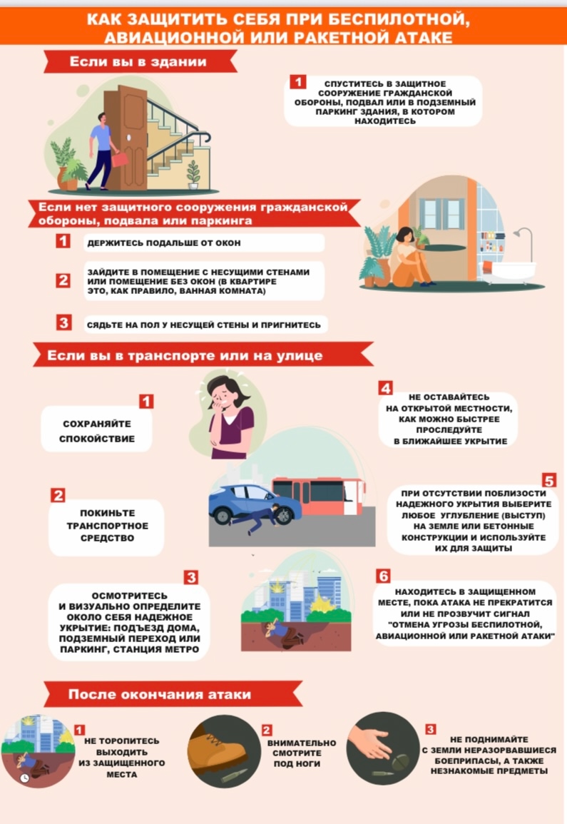С целью повышения информированности населения по действиям при возникновении беспилотной, авиационной или ракетной атаки предлагаем Вам ознакомиться с памяткой;